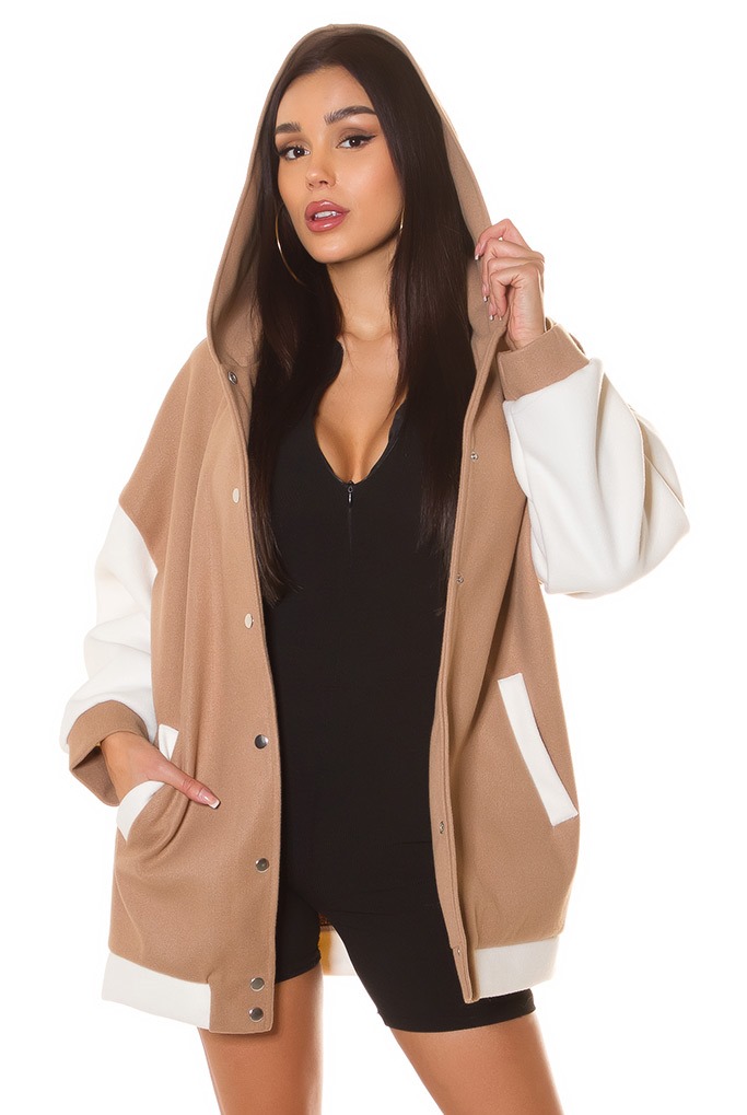 Taillierte Jacke aus leicht gefüttertem Kunstleder mit V-Ausschnitt und langen Ärmel. Ausschnitt mit breitem nicht abnehmbarem Kunstpelz-Kragen. Beidseitig an den Oberarmen mit abgesteppten Ziernähte. Ärmel unten mit Reißverschluss. Zipper-Taschen vorne. Seitlich auf Taillenhöhe mit Gürtelschlaufen, durch welche der abgebildete Kunstleder-Gürtel führt. Abschlusssaum mit aufgesetzter, breiter Kunstfell-Borte. Seitlich versetzter, schräger Reißverschluss vorne.