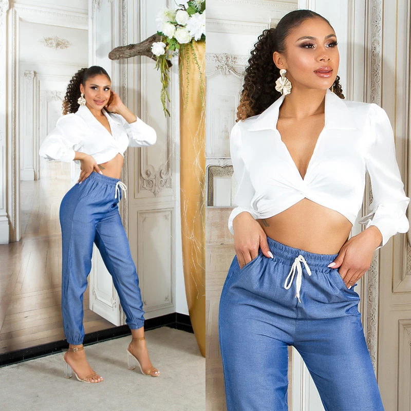 Lässige Hose aus leicht schimmerndem Stretch-Material in angesagter Highwaist-Form. Seitliche Eingrifftaschen. Dezenter Pump-Look durch Gummi-Bündchen an den Beinabschlüssen. Smok-Taillenbund mit Tunnelzug-Bändel. Allover Jeans-Optik.
